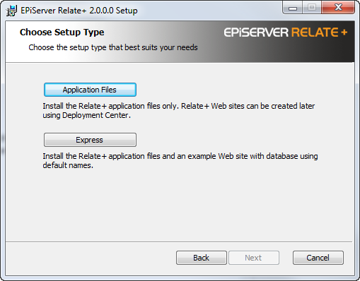 Application Files will install the Relate+ application files. The Relate+ website can then be created later through the EPiServer Deployment Center.