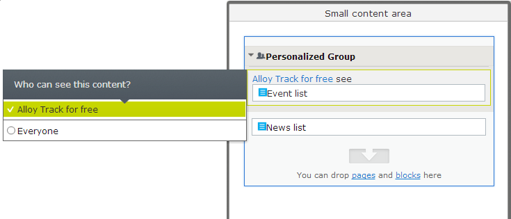 You can group blocks to be seen by a specific visitor group by dragging and dropping them into that area. If you have several blocks that match a visitor group, only the first matching block will be shown.