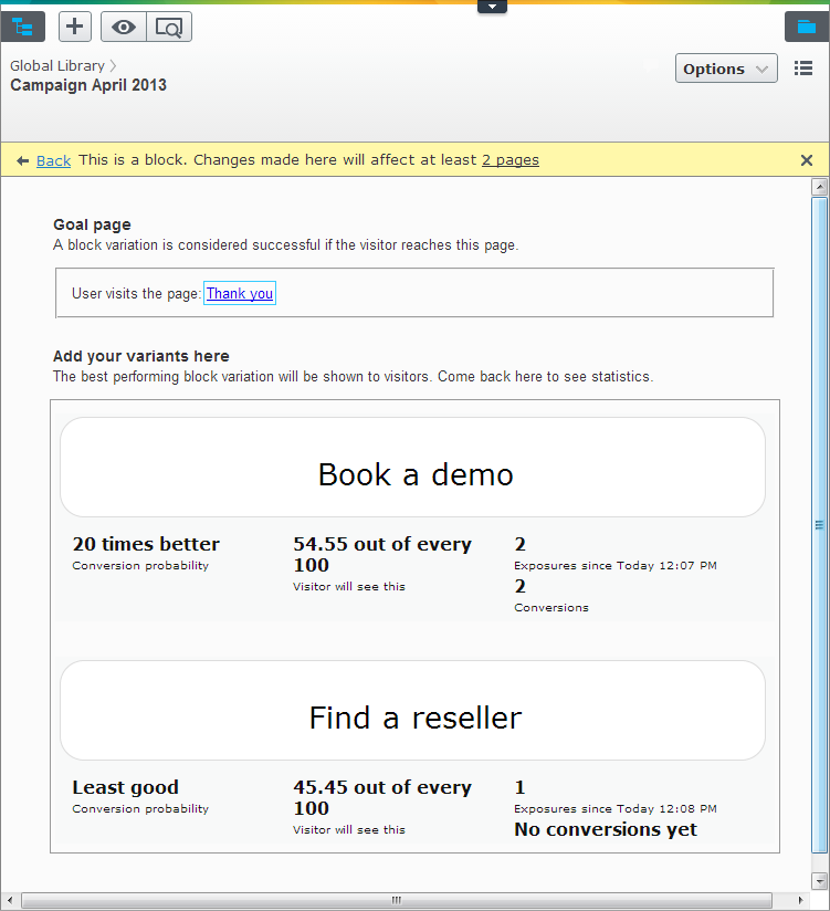 The multivariate testing block has an icon always visible to indicate that it contains other information than blocks normally do.