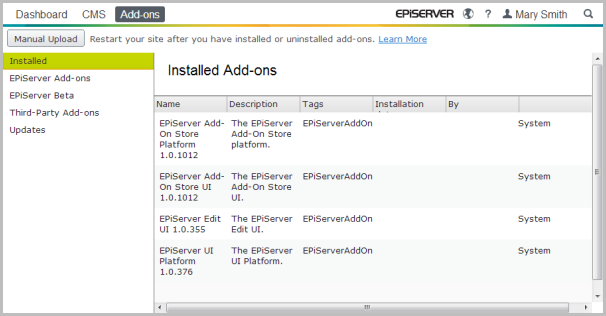 - As a site owner you can easily install, upgrade and un-install add-ons without the need of a developer.