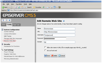Note: Be aware that only resources referred to in EPiServer CMS 5 pages can be mirrored. For example, when mirroring a page that refers to a stylesheet, and this stylesheet in turn refers to an image, the stylesheet will be mirrored since the page referred to it, the image will not.