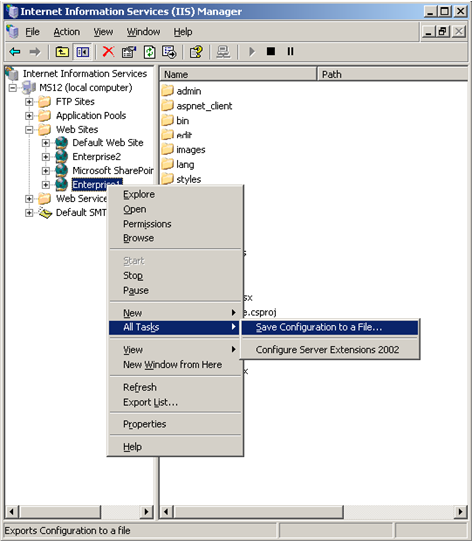 If you are running in a load-balanced scenario, you need to make sure that the load-balanced sites receive the same application ID and site short name (applicationID and siteShortName attributes as shown above) as the master Web site. If you are running Windows Server 2003, the easiest way to accomplish this is to use the Save Configuration to a File menu option in IIS Manager from the master site, and then create the slave site with the function New > Web Site (from file).
