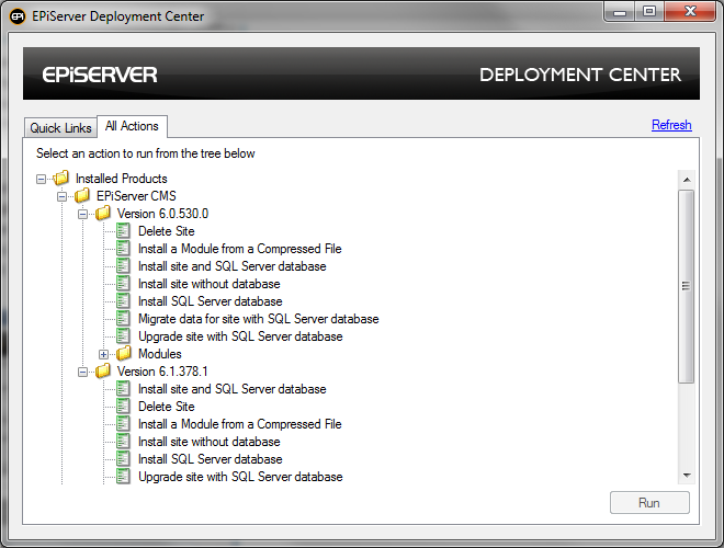 All installed EPiServer products that support EPiServer Deployment Center are shown in the tree under All Actions. Under each product node there is a version node for each version of the product installed. The tasks that can be performed for/on the product version are listed under the product version node.