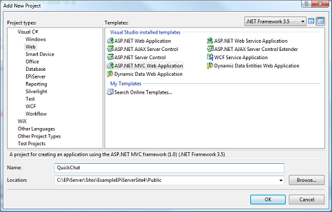 ASP.NET MVC includes some wizards to help out in the task of creating controllers and views. These are not enabled in the PublicTemplates.csproj installed with EPiServer CMS but they can be with some manual tweaking of the file. Right-click on the project and “Unload”, then “Edit …” it. Add {603c0e0b-db56-11dc-be95-000d561079b0}; to the list of existing project type guids. Now save, right click “Reload Project”.