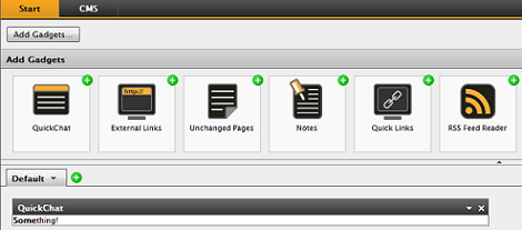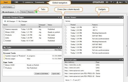 The dashboard is made up of tabs, zones and gadgets. Gadgets can easily be created (ASP.NET MVC) and plugged into the dashboard so that the user can use them (add to dashboard). A gadget is a self contained item and is responsible for its own rendering and behavior. A gadget can either contain functionality that can be used within the gadget interface or simple link away to other products integrated in the framework (for example; a direct link to CMS / Pages where you can use the classic editing mode features).