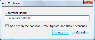 It’s time to create a gadget. Head to the QuickChat project, right click on the “Controllers” directory and “Add Controller”.