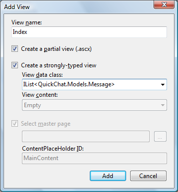 When the view is located in Views/QuickChat/Index.ascx in the quick chat project it will be automatically selected to show the messages.