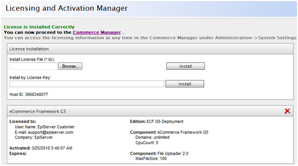 This document decribes how to update the Commerce Manager license - from a license key to a license file. The Commerce Manager license is not the same as the EPiServer Commerce License - (EPiServerCommerceLicense.config) which is installed during the initial installation of EPiServer Commerce as described in the Installation Instructions. The Commerce Manager license will be installed by default during installation of the EPiServer Commerce core package. Updating the Commerce Manager license should only be performed after consulting with EPiServer.