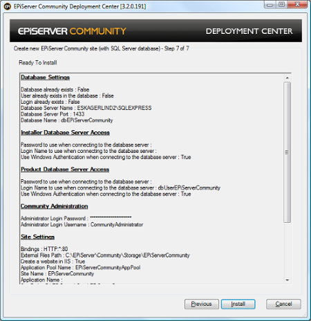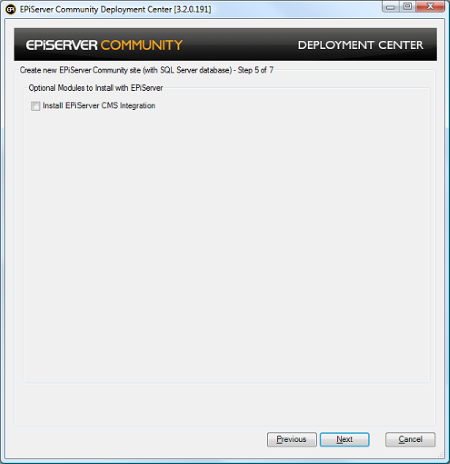 The next step give you the option to install the files needed to integrate EPIServer Community with EPiServer CMS. When you are installing a standalone EPiServer Community site this option should not be selected.