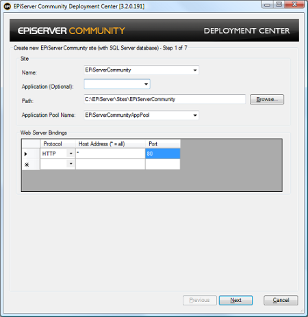The first step of the wizard concerns the IIS settings that should be used for the EPiServer Community site instance. You will need to provide configuration for your web server:
