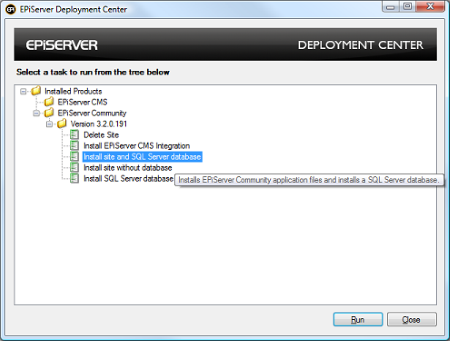EPiServer Deployment Center is used to create and delete instance of different EPiServer applications. In this particular case we want to create an EPiServer Community 3.2 site coupled with a database as highlighted in the image below, select this option and click Run.