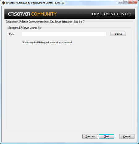 In the next step you can optionally provide a path for a license.config file that you want to use for the site. If omitted the site will be created but will report licensing errors: