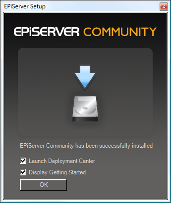 You now get the options to launch EPiServer Deployment Center and/or to display the Getting Started guide. You need to run EPiServer Deployment Center to create an EPiServer Community 3.2 site, so make sure that that box is checked before clicking OK.