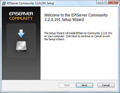 Once the EULA has been accepted the EPiServer Community installation wizard starts. This wizard has no options for you to select, you simply need to click next to start the installation.