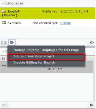 After you create a translation project, you can add content to it from the Languages context menu: