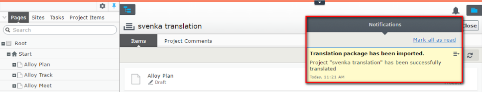 A notification also is sent to the project owner that the translation project was imported.